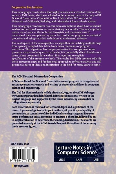 Efforts to understand and predict the behavior of software date back to the earliest days of computer programming,over half a century ago. In the intervening decades, the need for effective methods of understanding software has only increased; so- ware has spread to become the underpinning of much of modern society, and the potentially disastrous consequences of broken or poorly understood software have become all too apparent. Ben Liblit's work reconsiders two common assumptions about how we should analyze software and it arrives at some striking new results. Inprinciple,understandingsoftware is not such a hardproblem. Certainlya c- puter scientist studying programs appears to be in a much stronger position than, say, a biologist trying to understand a living organism or an economist trying to understand the behavior of markets, because the biologist and the economist must rely on indirect observation of the basic processes they wish to understand. A c- puterscientist, however,starts with a complete,precise descriptionof the behaviorof software-the program itself! Of course, the story turns out not to be so straightf- ward, because despite having a perfect description, programs are suf ciently c- plex that it is usually dif cult or even impossible to answer many simple questions about them.