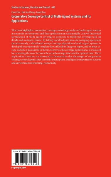 Introduction to Multi-Agent Cooperative Coverage Control.- Distributed Control Scheme for Online Workload Partition.- Decentralized Cooperative Sweep Coverage Algorithm in Uncertain Environments.- Adaptive Cooperative Coverage Algorithm with Online Learning Strategies.- Distributed Sweep Coverage Algorithm using Workload Memory.- Cooperative Sweep Coverage Algorithm of Discrete Time Multi-Agent Systems.- Coverage-Based Cooperative Interception against Supersonic Flight Vehicles.- Coverage-Based Cooperative Routing Algorithm for Unmanned Ground Vehicles.- Cooperative Coverage Control of Wireless Sensor Networks for Environment Monitoring.- Summary and Future Work.