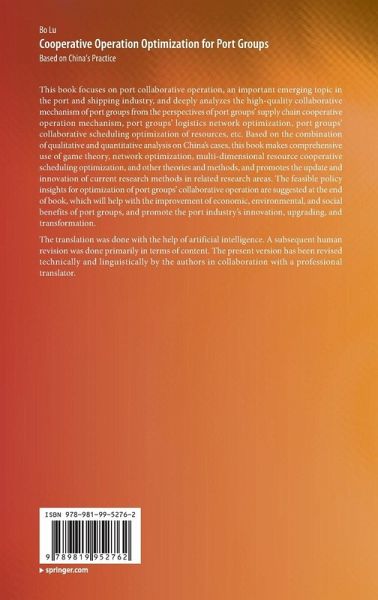 This book focuses on port collaborative operation, an important emerging topic in the port and shipping industry, and deeply analyzes the high-quality collaborative mechanism of port groups from the perspectives of port groups' supply chain cooperative operation mechanism, port groups' logistics network optimization, port groups' collaborative scheduling optimization of resources, etc. Based on the combination of qualitative and quantitative analysis on China's cases, this book makes comprehensive use of game theory, network optimization, multi-dimensional resource cooperative scheduling optimization, and other theories and methods, and promotes the update and innovation of current research methods in related research areas. The feasible policy insights for optimization of port groups' collaborative operation are suggested at the end of book, which will help with the improvement of economic, environmental, and social benefits of port groups, and promote the port industry's innovation, upgrading, and transformation.