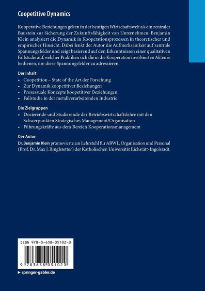 Kooperative Beziehungen gelten in der heutigen Wirtschaftswelt als ein zentraler Baustein zur Sicherung der Zukunftsfähigkeit von Unternehmen. Benjamin Klein analysiert die Dynamik in Kooperationsprozessen in theoretischer und empirischer Hinsicht. Dabei lenkt der Autor die Aufmerksamkeit auf zentrale Spannungsfelder und zeigt basierend auf den Erkenntnissen einer qualitativen Fallstudie auf, welcher Praktiken sich die in die Kooperation involvierten Akteure bedienen, um diese Spannungsfelder zu adressieren.