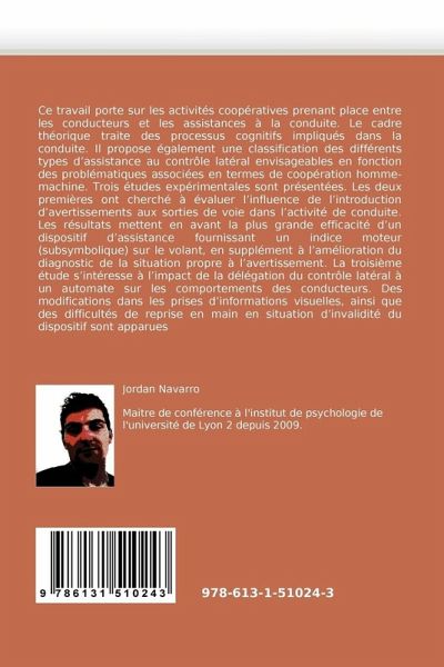 Ce travail porte sur les activités coopératives prenant place entre les conducteurs et les assistances à la conduite. Le cadre théorique traite des processus cognitifs impliqués dans la conduite. Il propose également une classification des différents types d assistance au contrôle latéral envisageables en fonction des problématiques associées en termes de coopération homme-machine. Trois études expérimentales sont présentées. Les deux premières ont cherché à évaluer l influence de l introduction d avertissements aux sorties de voie dans l activité de conduite. Les résultats mettent en avant la plus grande efficacité d un dispositif d assistance fournissant un indice moteur (subsymbolique) sur le volant, en supplément à l amélioration du diagnostic de la situation propre à l avertissement. La troisième étude s intéresse à l impact de la délégation du contrôle latéral à un automate sur les comportements des conducteurs. Des modifications dans les prises d informations visuelles, ainsi que des difficultés de reprise en main en situation d invalidité du dispositif sont apparues