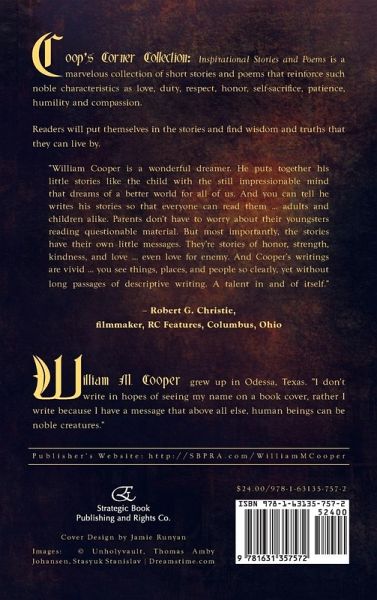 Coop's Corner Collection: Inspirational Stories and Poems is a marvelous collection of short stories and poems that reinforce such noble characteristics as love, duty, respect, honor, self-sacrifice, patience, humility and compassion.Readers will put themselves in the stories and find wisdom and truths that they can live by. "William Cooper is a wonderful dreamer. He puts together his little stories like the child with the still impressionable mind that dreams of a better world for all of us. And you can tell he writes his stories so that everyone can read them ... adults and children alike. Parents don't have to worry about their youngsters reading questionable material. But most importantly, the stories have their own little messages. They're stories of honor, strength, kindness, and love ... even love for enemy. And Cooper's writings are vivid ... you see things, places, and people so clearly, yet without long passages of descriptive writing. A talent in and of itself." - Robert G. Christie, filmmaker, RC Features, Columbus, Ohio William M. Cooper grew up in Odessa, Texas. "I don't write in hopes of seeing my name on a book cover, rather I write because I have a message that above all else, human beings can be noble creatures."