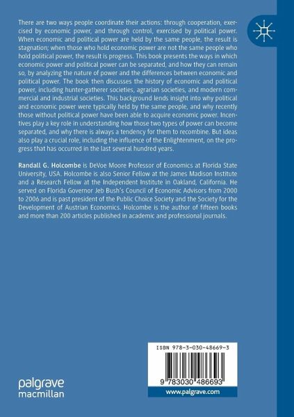 There are two ways people coordinate their actions: through cooperation, exercised by economic power, and through control, exercised by political power. When economic and political power are held by the same people, the result is stagnation; when those who hold economic power are not the same people who hold political power, the result is progress. This book presents the ways in which economic power and political power can be separated, and how they can remain so, by analyzing the nature of power and the differences between economic and political power. The book then discusses the history of economic and political power, including hunter-gatherer societies, agrarian societies, and modern commercial and industrial societies. This background lends insight into why political and economic power were typically held by the same people, and why recently those without political power have been able to acquire economic power. Incentives play a key role in understanding how those two typesof power can become separated, and why there is always a tendency for them to recombine. But ideas also play a crucial role, including the influence of the Enlightenment, on the progress that has occurred in the last several hundred years.