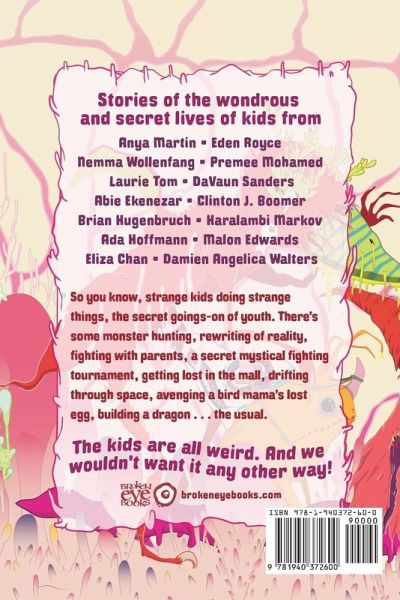 Stories of the wondrous and secret lives of kids from Anya Martin ¿ Eden Royce ¿ Nemma Wollenfang ¿ Premee Mohamed ¿ Laurie Tom ¿ DaVaun Sanders ¿ Abie Ekenezar ¿ Clinton J. Boomer ¿ Brian Hugenbruch ¿ Haralambi Markov ¿ Ada Hoffmann ¿ Malon Edwards ¿ Eliza Chan ¿ Damien Angelica Walters So you know, strange kids doing strange things, the secret goings-on of youth. There's some monster hunting, rewriting of reality, fighting with parents, a secret mystical fighting tournament, getting lost in the mall, drifting through space, avenging a bird mama's lost egg, building a dragon . . . the usual. The kids are all weird. And we wouldn't want it any other way!