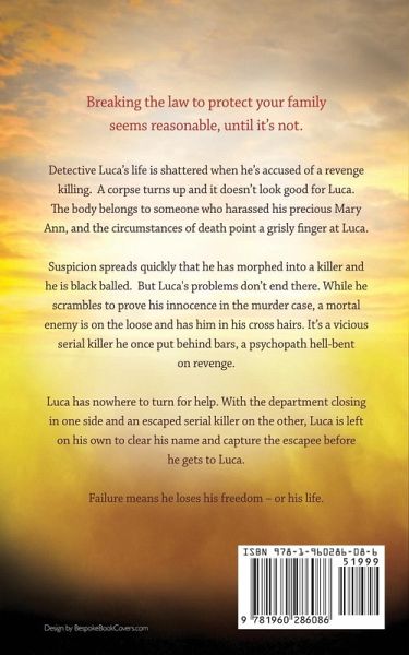 Breaking the law to protect your family seems reasonable...until its not. Detective Luca's life is shattered when he's accused of a revenge killing. A corpse turns up and it doesn't look good for Luca. The body belongs to someone who harassed his precious Mary Ann, and the circumstances of death point a grisly finger at Luca. Suspicion spreads quickly that he has morphed into a killer and he's black balled. But Luca's problems don't end there. While he scrambles to prove his innocence in the murder case, a mortal enemy is on the loose and has him in his cross hairs. Its a vicious serial killer he once put behind bars, a psychopath hell-bent on revenge. Luca has nowhere to turn for help. With the department closing in one side and an escaped serial killer on the other, Luca is left on his own to clear his name and capture the escapee before he gets to Luca. Failure means he loses his freedom - or his life.