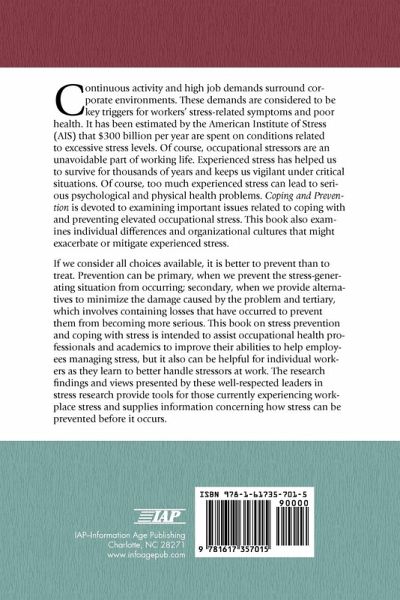 Continuous activity and high job demands surround corporate environments. These demands are considered to be key triggers for workers' stress-related symptoms and poor health. It has been estimated by the American Institute of Stress (AIS) that US$ 300 billion/year are spent on conditions related to excessive stress levels. Of course, occupational stressors are an unavoidable part of working life. Experienced stress has helped us to survive for thousands of years and keeps us vigilant under critical situations. Of course, too much experienced stress can lead to serious psychological and physical health problems. This book is devoted to examining important issues related to coping with and preventing elevated occupational stress. This book also examines individual differences and organizational cultures that might exacerbate or mitigate experienced stress. If we consider all choices available, it is better to prevent than to treat. Prevention can be primary, when we prevent the stress-generating situation from occurring; secondary, when we provide alternatives to minimize the damage caused by the problem and tertiary, which involves containing losses that have occurred to prevent them from becoming more serious. This book on stress prevention and coping with stress is intended to assist occupational health professionals and academics to improve their abilities to help employees managing stress, but it also can be helpful for individual workers as they learn to better handle stressors at work. The research findings and views presented by these well-respected leaders in stress research provide tools for those currently experiencing workplace stress and supplies information concerning how stress can be prevented before it occurs.