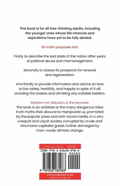 Coping in Broken Britain is for all open-minded adults. It is especially useful for those in early adulthood whose life opportunities have yet to be fully denied. Its main purposes are: firstly, to inform readers about the sad state of the nation after years of political abuse and mismanagement; secondly to assess its prospects for renewal and regeneration; thirdly to provide information and advice on how to live safely, healthily, and happily in spite of it all, avoiding the many snakes, climbing any ladders that suit. Realism not fantasy is the keynote. This book is an antidote to the very dangerous 'false truth' myths that now abound, promoted by the popular press and the anti - social media, in a society corrupted by inhumane capitalist greed, being further damaged by man-made climate change.