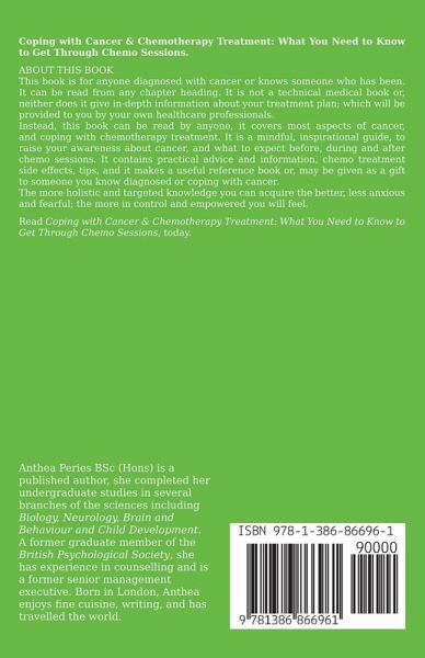 Coping with Cancer & Chemotherapy Treatment: What You Need to Know to Get Through Chemo Sessions. ABOUT THIS BOOK This book is for anyone diagnosed with cancer or knows someone who has been. It can be read from any chapter heading. It is not a technical medical book or, neither does it give in-depth information about your treatment plan; which will be provided to you by your own healthcare professionals. Instead, this book can be read by anyone, it covers most aspects of cancer, and coping with chemotherapy treatment. It is a mindful, inspirational guide, to raise your awareness about cancer, and what to expect before, during and after chemo sessions. It contains practical advice and information, chemo treatment side effects, tips, and it makes a useful reference book or, may be given as a gift to someone you know diagnosed or coping with cancer. The more holistic and targeted knowledge you can acquire the better, less anxious and fearful; the more in control and empowered you will feel. Order your copy of Coping with Cancer & Chemotherapy Treatment: What You Need to Know to Get Through Chemo Sessions, today. GET THIS BOOK NOW. Also available: How Can You Help Someone with Cancer, Dealing with Cancer Family Member, Facing Cancer Alone, Dealing with Terminal Cancer Diagnosis, Chemotherapy Treatment & Recovery.