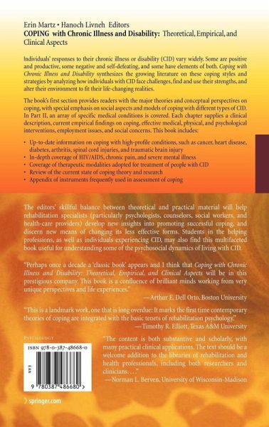 "This book describes how individuals cope with chronic illness and disability, covering conceptual, empirical, and clinical aspects. The contributors discuss coping with 12 specific illnesses. ... The book is intended for rehabilitation specialists, particularly psychologists, counselors, social workers, and healthcare providers, as well as students in the helping professionals and individuals experiencing CID. ... tackles the topic of copying with chronic illness and disability very completely." (Gary B Kaniuk, Doody's Review Service, November, 2007)