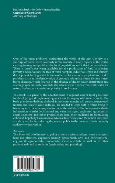 This book is a guide to the establishment of regional and/or local guidelines for developing and implementing new ideas for coping with water scarcity. The basic premise underlying the book is that water scarcity will persist, so personal, human and society-wide skills will be needed to cope with it while living in harmony with the necessary environmental constraints. The book provides basic information to assist decision makers, water managers, engineers, agronomists, social scientists and other professions (and their students) in formulating coherent, hopefully harmonious and consolidated views on the issue. Guidelines are also given for introducing the general public to the concept of water scarcity and how to deal with it.
