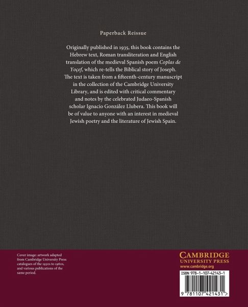 Originally published in 1935, this book contains the Hebrew text, Roman transliteration and English translation of the medieval Spanish poem 'Coplas de Yoçef', which re-tells the biblical story of Joseph. The text is taken from a fifteenth-century manuscript in the collection of the Cambridge University Library, and is edited with critical commentary and notes by the celebrated Judaeo-Spanish scholar Ignacio González Llubera. This book will be of value to anyone with an interest in medieval Jewish poetry and the literature of Jewish Spain.