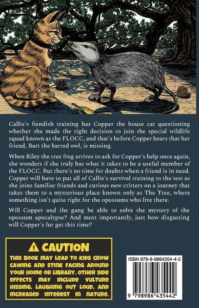 Caution! This book may lead to kids crow cawing and stink facing around your home or library. Other side effects may include vulture hissing, laughing out loud, and increased interest in nature. Callie's fiendish training has Copper the house cat questioning whether she made the right decision to join the special wildlife squad known as the FLOCC, and that's before Copper hears that her friend, Bart the barred owl, is missing. When Riley the tree frog arrives to ask for Copper's help once again, she wonders if she truly has what it takes to be a useful member of the FLOCC. But there's no time for doubts when a friend is in need. Copper will have to put all of Callie's survival training to the test as she joins familiar friends and curious new critters on a journey that takes them to a mysterious place known only as The Tree, where something isn't quite right for the opossums who live there. Will Copper and the gang be able to solve the mystery of the opossum apocalypse? And most importantly, just how disgusting will Copper's fur get this time?