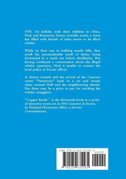 1978. On holiday with their children in Oban, Nick and Rosemary Storey stumble across a stone hut filled with barrels of what seems to be illicit whisky. While on their way to walking nearby hills, they smell the unmistakeable smell of barley being fermented in a mash tun before distillation. But having overheard a conversation about the illegal whisky operation, Nick is unable to contact the local police or Excise officer. A chance remark and the arrival of the Customs cutter "Venturous" leads to a cat and mouse chase around Mull and the neighbouring islands. But there may be a price to pay for catching the whisky smugglers. "Copper Kettle" is the thirteenth book in a series of detective stores set in HM Customs & Excise, by Richard Hernaman Allen, a former Commissioner.