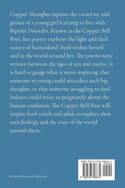 Copper Thoughts exposes the creativity and genius of a young girl learning to live with Bipolar Disorder. Known as the Copper Bell Poet, her poetry explores the light and dark nature of humankind, both within herself and in the world around her. The poems were written between the ages of ten and twelve. It is hard to gauge what is more inspiring, that someone so young could articulate such big thoughts, or that someone struggling to find balance could write so poignantly about the human condition. The Copper Bell Poet will inspire both youth and adult to explore their own feelings and the state of the world around them.