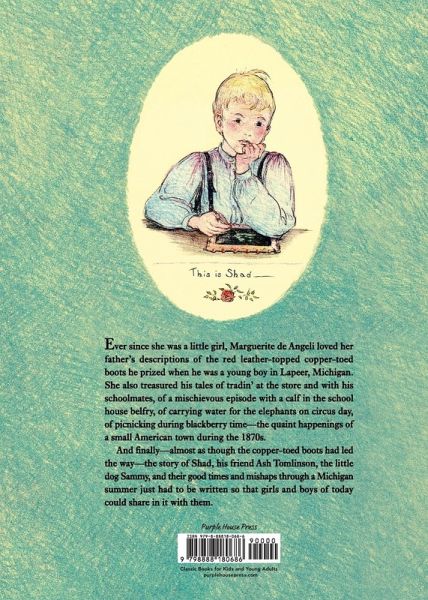 Ever since she was a little girl, Marguerite de Angeli loved her father's descriptions of the red leather-topped copper-toed boots he prized when he was a young boy in Lapeer, Michigan. She also treasured his tales of tradin' at the store and with his schoolmates, of a mischievous episode with a calf in the school house belfry, of carrying water for the elephants on circus day, of picnicking during blackberry time--the quaint happenings of a small American town during the 1870s. And finally--almost as though the copper-toed boots had led the way--the story of Shad, his friend Ash Tomlinson, the little dog Sammy, and their good times and mishaps through a Michigan summer just had to be written so that girls and boys of today could share in it with them.