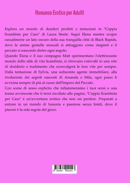Esplora un mondo di desideri proibiti e tentazioni in "Coppia Scambista per Caso" di Laura Steele. Segui Elena mentre scopre casualmente un lato oscuro della sua tranquilla città di Black Rapids, dove le anime gemelle sessuali si attraggono come magneti e il peccato si nasconde dietro ogni angolo.Quando Elena e il suo compagno Matt sperimentano l'elettrizzante mondo dello stile di vita Scambista, si ritrovano coinvolti in una rete di desiderio e tradimento che sconvolgerà le loro vite per sempre. Dalla tentazione di Sylvia, una seducente agente immobiliare, alla rivelazione dei segreti nascosti di Amanda e Mila, ogni passo li avvicina sempre di più al cuore dell'Impero del Peccato.Con scene di sesso esplicito che infiammeranno i tuoi sensi e una trama avvincente che ti terrà incollato alle pagine, "Coppia Scambista per Caso" è un'avventura erotica che non osi perdere. Preparati a entrare in un mondo di lussuria e passione senza limiti, dove il piacere è la sola regola del gioco.