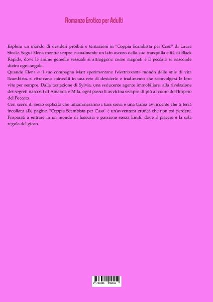 Esplora un mondo di desideri proibiti e tentazioni in "Coppia Scambista per Caso" di Laura Steele. Segui Elena mentre scopre casualmente un lato oscuro della sua tranquilla città di Black Rapids, dove le anime gemelle sessuali si attraggono come magneti e il peccato si nasconde dietro ogni angolo.Quando Elena e il suo compagno Matt sperimentano l'elettrizzante mondo dello stile di vita Scambista, si ritrovano coinvolti in una rete di desiderio e tradimento che sconvolgerà le loro vite per sempre. Dalla tentazione di Sylvia, una seducente agente immobiliare, alla rivelazione dei segreti nascosti di Amanda e Mila, ogni passo li avvicina sempre di più al cuore dell'Impero del Peccato.Con scene di sesso esplicito che infiammeranno i tuoi sensi e una trama avvincente che ti terrà incollato alle pagine, "Coppia Scambista per Caso" è un'avventura erotica che non osi perdere. Preparati a entrare in un mondo di lussuria e passione senza limiti, dove il piacere è la sola regola del gioco.