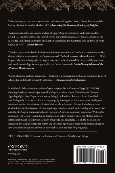 In this book, Febe Armanios explores Coptic religious life in Ottoman Egypt (1517-1798), focusing closely on manuscripts housed in Coptic archives. Ottoman Copts frequently turned to religious discourses, practices, and rituals as they dealt with various transformations in the first centuries of Ottoman rule. These included the establishment of a new political regime, changes within communal leadership structures (favoring lay leaders over clergy), the economic ascent of the archons (lay elites), and developments in the Copts' relationship with other religious communities, particularly with Catholics.