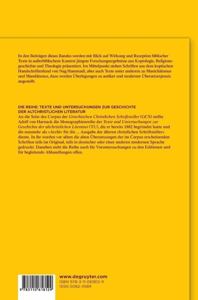 Den Kern des Buches bilden Beiträge des 3. internationalen Wortkshops "Coptica - Gnostica - Mandaica", der im Herbst 2017 in Prag stattfand. In ihnen werden mit Blick auf Wirkung und Rezeption biblischer Texte in außerbiblischem Kontext jüngste Forschungsergebnisse aus Koptologie, Religionsgeschichte und Theologie präsentiert. Im Mittelpunkt der Untersuchungen stehen Schriften aus dem koptischen Handschriftenfund von Nag Hammadi, doch kommen auch Texte unter anderem zu Manichäismus und Mandäismus zu Wort und werden Überlegungen zu antiker und moderner Übersetzerpraxis angestellt. Insgesamt werden in diesem Band verschiedenartige Themen behandelt, die von allgemeinen Erwägungen, philologischen, literaturwissenschaftlichen und exegetischen Fragestellungen bis hin zu missions- und rezeptionsgeschichtlicher Darstellung in Wort und Bild reichen und das Interesse von Religionshistorikern, Koptologen, Theologen und klassischen Philologen finden dürften.