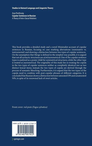 This book provides a detailed study and a novel Minimalist account of copular sentences in Russian, focusing on case marking alternations (nominative vs. instrumental) and drawing a distinction between two types of copular sentences.