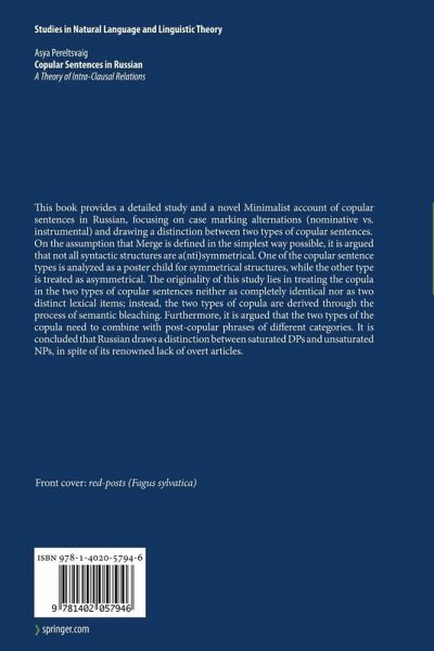 This book provides a detailed study and a novel Minimalist account of copular sentences in Russian, focusing on case marking alternations (nominative vs. instrumental) and drawing a distinction between two types of copular sentences.