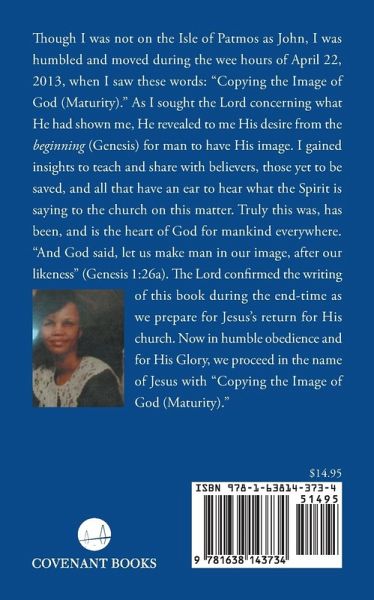 Though I was not on the Isle of Patmos as John, I was humbled and moved during the wee hours of April 22, 2013, when I saw these words: "Copying the Image of God (Maturity)." As I sought the Lord concerning what He had shown me, He revealed to me His desire from the beginning (Genesis) for man to have His image. I gained insights to teach and share with believers, those yet to be saved, and all that have an ear to hear what the Spirit is saying to the church on this matter. Truly this was, has been, and is the heart of God for mankind everywhere. "And God said, let us make man in our image, after our likeness" (Genesis 1:26a). The Lord confirmed the writing of this book during the end-time as we prepare for Jesus's return for His church. Now in humble obedience and for His Glory, we proceed in the name of Jesus with "Copying the Image of God (Maturity)."