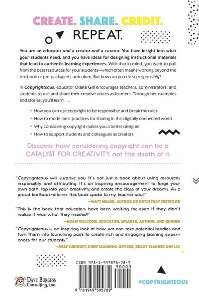 Create. Share. Credit. Repeat. You are an educator and a creator and a curator. You have insight into what your students need, and you have ideas for designing instructional materials that lead to authentic learning experiences. With that in mind, you want to pull from the best resources for your students—which often means working beyond the textbook or pre-packaged curriculum. But how can you do so responsibly? In Copyrighteous, educator Diana Gill encourages teachers, administrators, and students to use and share their creative voices as learners. Through her examples and stories, you’ll learn . . . How you can use copyright to be responsible and break the rules How to model best practices for sharing in this digitally connected world Why considering copyright makes you a better designer How to support students and colleagues as creators Discover how considering copyright can be a catalyst for creativity, not the death of it. "Copyrighteous will surprise you. It’s not just a book about using resources responsibly and attributing. It’s an inspiring encouragement to forge your own path, tap into your creativity and create the class of your dreams. As a proud textbook ditcher, this book spoke to my teacher soul!" —Matt Miller, author of Ditch That Textbook "This is the book that educators have been waiting for, even if they didn’t realize it was what they needed!" —Adam Welcome, educator, speaker, author, and runner "Copyrighteous is an inspiring look at how we can take potential hurdles and turn them into launching pads to create rich and engaging learning experiences for our students." —Jesse Lubinsky, chief learning officer, Ready Learner One LLC