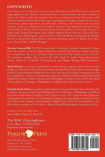 The editors of COPY(WRITE): INTELLECTUAL PROPERTY IN THE WRITING CLASSROOM bring together stories, theories, and research that can further inform the ways in which we situate and address intellectual property issues in our writing classrooms. The essays in the collection identify and describe a wide range of pedagogical strategies, consider theories, present research, explore approaches, and offer both cautionary tales and local and contextual successes. Essays are contributed by TIMOTHY R. AMIDON, BRIAN BALLENTINE, BARCLAY BARRIOS, DÀNIELLE NICOLE DEVOSS, KATIE DONNELLY, ROBERT DORNSIFE, JEFFREY GALIN, KATHIE GOSSETT, E. ASHLEY HALL, TYANNA HERRINGTON, RENEE HOBBS, REBECCA MOORE HOWARD, THARON W. HOWARD, JOHN LOGIE, NICOLE NGUYEN, JAMES E. PORTER, CLANCY RATLIFF, JESSICA REYMAN, JIM RIDOLFO, MARTINE COURANT RIFE, SHAUN SLATTERY, ELIZABETH VINCELETTE, JANICE R. WALKER, STEVE WESTBROOK, RUSSEL WIEBE, AND BOB WHIPPLE. MARTINE COURANT RIFE, JD, PhD, is a professor of writing at Lansing Community College, where she teaches courses in digital authorship, technical and business writing, and first-year composition. She serves as Senior Chair of the CCCC-IP Caucus and is a CCCC-IP Committee member. Rife received the 2007 Frank R. Smith Outstanding Journal Article Award for "Technical Communicators and Digital Writing Risk Assessment." SHAUN SLATTERY is a strategy consultant for a social software company and has been a faculty member at DePaul University and the University of South Florida Polytechnic, where he taught technical and professional writing and new media. His research on digital writing practices has been published in Technical Communication Quarterly; Technical Communication; Rhetorically Rethinking Usability: Theories, Practices, and Methodologies (Hampton Press, 2009); and Digital Writing Research: Technologies, Methodologies, and Ethical Issues (Hampton Press, 2007). DÀNIELLE NICOLE DEVOSS is a professor of professional writing at Michigan State University. Her co-edited collections include Digital Writing Research: Technologies, Methodologies, and Ethical Issues (with Heidi McKee; Hampton, 2007), which won the 2007 Computers and Composition Distinguished Book Award, and Technological Ecologies and Sustainability (with Heidi McKee and Dickie Selfe; Computers and Composition Digital Press, 2007). She also published-with Elyse Eidman-Aadahl and Troy Hicks-Because Digital Writing Matters (Jossey-Bass, 2010).