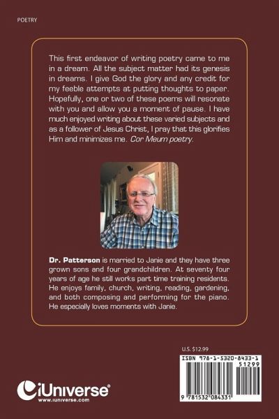 This first endeavor of writing poetry came to me in a dream. All the subject matter had its genesis in dreams. I give God the glory and any credit for my feeble attempts at putting thoughts to paper. Hopefully, one or two of these poems will resonate with you and allow you a moment of pause. I have much enjoyed writing about these varied subjects and as a follower of Jesus Christ, I pray that this glorifies Him and minimizes me. Cor Meum poetry.