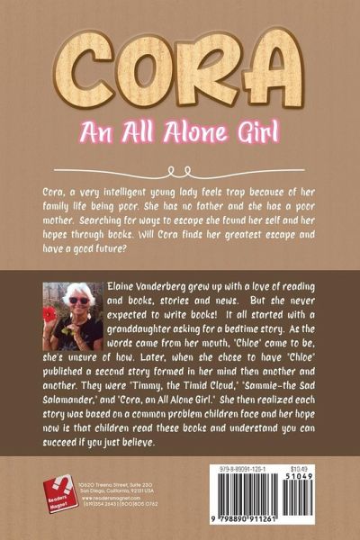 Elaine Vanderberg grew up with a love of reading and books, stories and news. But she never expected to write books! It all started with a granddaughter asking for a bedtime story. As the words came from her mouth, "Chloe" came to be, she's unsure of how. Later, when she chose to have "Chloe" published a second story formed in her mind then another and another. They were "Timmy, the Timid Cloud," "Sammie-the Sad Salamander," and "Cora, an All Alone Girl." She then realized each story was based on a common problem children face and her hope now is that children read these books and understand you can succeed if you just believe.