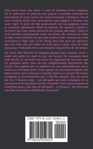 Uma suave brisa caía sobre o rosto de Matthew Price enquanto ele se debruçava no pátio do seu quintal. O barulho constante de uma buzina de carro tocava um sinal acentuado à distância. Um de seus vizinhos devia estar descontente para golpear a buzina com tanto vigor. O gosto da bile aumentando em sua garganta estava se tornando igualmente difícil de ignorar. Ele apertou o punho e permitiu que suas unhas batessem nas palmas das mãos. Todos os seus sentidos funcionavam como deveriam. Ele contava-os todos os dias como lembrete de que não perdera tudo. Apenas sua visão continuava a fugir dele. O Dr. Sousa disse-lhe para ser paciente, que sua visão não iria voltar da noite para a noite, mas ele tinha esperança. Tinha sido tolo e um completo desperdício de seu tempo. Ele havia sido liberado do hospital apenas duas semanas atrás, e ainda não podia ver mais do que um borrão. Ele conseguia fazer tudo direito se movendo em torno da segurança de sua casa, mas em qualquer outra coisa ele era completamente dependente dos outros. Para alguém que se orgulhava de sua independência, isso o levara ao nível mais baixo. Tanto quanto ele estava preocupado, não havia motivo para continuar tentando. Qual era o ponto? Ele estava resignado às circunstâncias que a vida lhe causava. Isso era quem ele era. O homem cego - um advogado que nem conseguia ler as anotações de lei que havia escrito. Pesquisa? Seria quase impossível completar agora. Que tipo de advogado - ou homem - ele seria sem uma das mais básicas habilidades humanas?