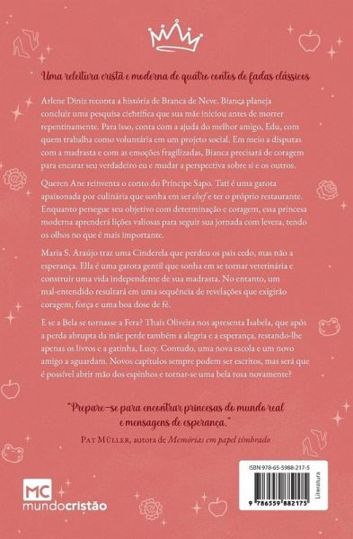 Uma releitura cristã e moderna de quatro contos de fadas clássicos Arlene Diniz reconta a história de Branca de Neve. Bianca planeja concluir uma pesquisa científica que sua mãe iniciou antes de morrer repentinamente. Para isso, conta com a ajuda do melhor amigo, Edu, com quem trabalha como voluntária em um projeto social. Em meio a disputas com a madrasta e emoções fragilizadas, Bianca precisará de coragem para encarar seu verdadeiro eu e mudar a perspectiva sobre si e os outros. Queren Ane reinventa o conto do Príncipe sapo. Tati é uma garota apaixonada por culinária que sonha em ser chef e ter o próprio restaurante. Enquanto persegue seu objetivo com determinação e coragem, essa princesa moderna aprenderá lições valiosas para seguir sua jornada com leveza, tendo os olhos no que é mais importante. Maria S. Araújo traz uma Cinderela que perdeu os pais cedo, mas não a esperança. Ella é uma garota gentil que sonha em se tornar veterinária e construir uma vida independente de sua madrasta. No entanto, um mal-entendido resultará em uma sequência de revelações que exigirão coragem, força e uma boa dose de fé. E se a Bela se tornasse a Fera? Thaís Oliveira nos apresenta Isabela, que após a perda abrupta da mãe perde também a alegria e a esperança, restando-lhe apenas os livros e a gatinha, Lucy. Contudo, uma nova escola e um novo amigo a aguardam. Novos capítulos sempre podem ser escritos, mas será que é possível abrir mão dos espinhos e tornar-se uma bela rosa novamente? "Prepare-se para encontrar princesas do mundo real e mensagens de esperança." Pat Müller, autora de Memórias em papel timbrado