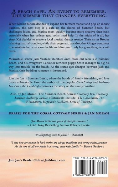 A beach cafe. An event to remember. The summer continues.**From a USA Today Bestselling Author** When Marina Moore decides to expand her farmer's market and pop-up dinner business, the next step is a cafe on the shores of Summer Beach. But challenges loom, and Marina must quickly become more creative than ever, especially when her children need help. Her sister Kai's position with a musical theater troupe forces more changes. Their sister Brooke is having marital challenges, while grandmother Ginger continues to contribute her advice on the life well-lived, if only her granddaughters will listen. Meanwhile, writer Jack Ventana stumbles onto more old secrets in Summer Beach, and his overgrown Labrador retriever puppy Scout manages to dig his way into trouble on the beach. When the status quo changes between Jack and Marina, their budding romance is threatened. Join the fun once again in Summer Beach, where the bonds of friendship and love prove unbreakable. From the author of the USA Today bestselling Seabreeze Inn at Summer Beach book series, the Coral Cafe is a new chapter on the sunny coastline. REVIEWS "I love how the women in Jan's stories are always intelligent and strong. At the core of all her books is a strong, close-knit family." - Reviewer B.J.T. "Jan Moran is the new queen of the epic romance." - USA Today Bestselling Author Rebecca Forster "[Jan Moran is] is a compelling voice to follow." - Booklist "Each of Jan Moran's books is captivating and reflects her love of the written word, as well as her insatiable curiosity." - Reviewer Andrea S.