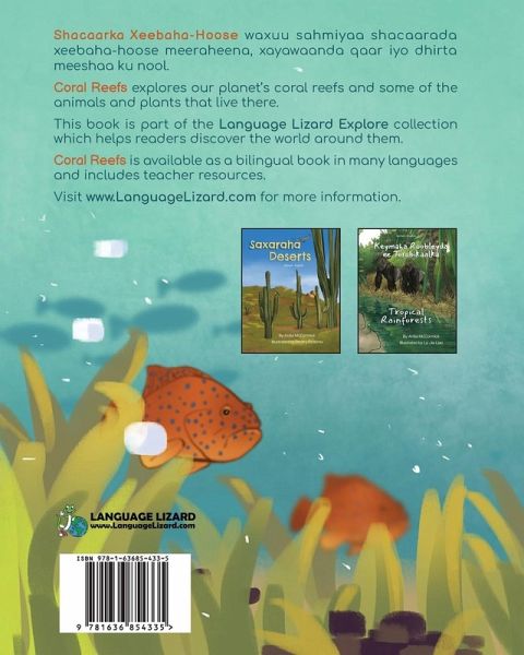 How does the coral reef get its spectacular colors? What fish live in coral reefs?Learn all about the coral reef and the species that call it home. This book is part of the Language Lizard Explore collection, which uses vibrant illustrations and simple text to help readers discover the world around them. Coral Reefs is available as a bilingual book in many languages and includes teacher resources and English audio. The other books in the Language Lizard Habitat series are:Deserts by Anita McCormick, Illustrated by Dmitry Fedorov Tropical Rainforests by Anita McCormick, Illustrated by Lu Jia Liao