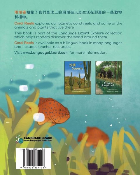How does the coral reef get its spectacular colors? What fish live in coral reefs?Learn all about the coral reef and the species that call it home. This book is part of the Language Lizard Explore collection, which uses vibrant illustrations and simple text to help readers discover the world around them. Coral Reefs is available as a bilingual book in many languages and includes teacher resources and English audio. The other books in the Language Lizard Habitat series are:Deserts by Anita McCormick, Illustrated by Dmitry Fedorov Tropical Rainforests by Anita McCormick, Illustrated by Lu Jia Liao