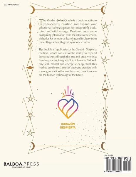 The Awaken Heart Oracle is a book to activate your heart's intuition and expand your emotional consciousness by integrating body, mind and vital energy. Designed as a game combining information from the affective sciences, didactics for emotional learning and imagery from the collage arts with great symbolic content. This book is the application of the Corazón Despierta method, which consists of the ability to expand consciousness through the arts and creativity in a learning process, integrated into 4 levels: emotional, physical, mental and energetic or spiritual.This method condenses 7 years of study and practice, with a strong conviction that emotions and consciousness are the human technology of the future.