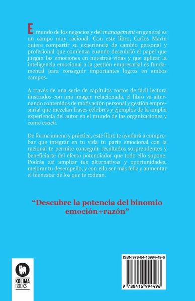 El mundo de los negocios y del management en general, es un campo muy racional. Con este libro Carlos Marín quiere compartir su experiencia de cambio personal y profesional que se inició cuando descubrió el papel que juegan las emociones en nuestras vidas y que aplicar la inteligencia emocional a la gestión empresarial es fundamental para conseguir importantes logros en ambos campos. De forma amena y práctica, este libro te ayudará a comprobar que integrar en tu vida tu parte emocional con la racional te permite conseguir resultados sorprendentes y beneficiarte del efecto potenciador que todo ello supone. ¿Podrás así ampliar tus alternativas y oportunidades, mejorar tu desempeño y con ello ser más feliz y aumentar el bienestar todos los que te rodean.