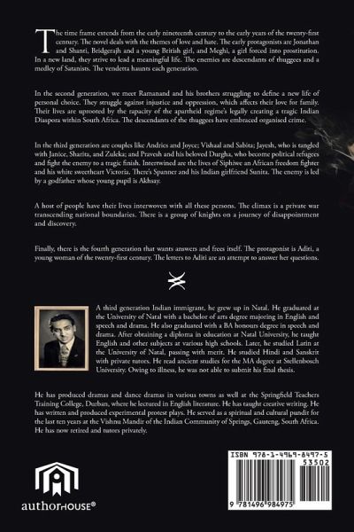 The time frame extends from the early nineteenth century to the early years of the twenty-first century. The novel deals with the themes of love and hate. The early protagonists are Jonathan and Shanti, Bridgerajh and a young British girl, and Meghi, a girl forced into prostitution. In a new land, they strive to lead a meaningful life. The enemies are descendants of thuggees and a medley of Satanists. The vendetta haunts each generation. In the second generation, we meet Ramanand and his brothers struggling to define a new life of personal choice. They struggle against injustice and oppression, which affects their love for family. Their lives are uprooted by the rapacity of the apartheid regime's legally creating a tragic Indian Diaspora within South Africa. The descendants of the thuggees have embraced organised crime. In the third generation are couples like Andries and Joyce; Vishaal and Sabita; Jayesh, who is tangled with Janice, Sharita, and Zuleka; and Pravesh and his beloved Durgha, who become political refugees and fight the enemy to a tragic finish. Intertwined are the lives of Siphiwe an African freedom fighter and his white sweetheart Victoria. There's Spanner and his Indian girlfriend Sunita. The enemy is led by a godfather whose young pupil is Akhsay. A host of people have their lives interwoven with all these persons. The climax is a private war transcending national boundaries. There is a group of knights on a journey of disappointment and discovery. Finally, there is the fourth generation that wants answers and frees itself. The protagonist is Aditi, a young woman of the twenty-first century. The letters to Aditi are an attempt to answer her questions.