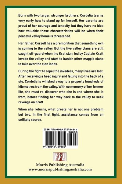 Born with two larger, stronger brothers, Cordelia learns very early how to stand up for herself. Her parents are proud of her courage and tenacity, but they have no idea how valuable those characteristics will be when their peaceful valley home is threatened. Her father, Corzell has a premonition that something evil is coming to the valley. But the five valley clans are still caught off-guard when the Krat clan, led by Captain Kratt invade the valley and start to banish other magpie clans to take over the clan lands. During the fight to repel the invaders, many lives are lost. After receiving a head injury and falling into the back of a ute, Cordelia is whisked away to a property hundreds of kilometres from the valley. With no memory of her former life, she must re-discover who she is and where she is from, before finding her way back to the valley to seek revenge on Kratt. When she returns, what greets her is not one problem but two. In the final fight, assistance comes from an unlikely source.