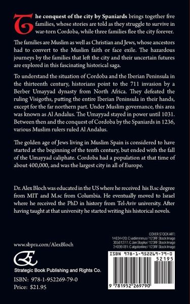 The conquest of the city by Spaniards brings together five families, whose stories are told as they struggle to survive in war-torn Cordoba, while three families flee the city forever. The families are Muslim as well as Christian and Jews, whose ancestors had to convert to the Muslim faith or face exile. The hazardous journeys by the families that left the city and their uncertain futures are explored in this fascinating historical saga. To understand the situation of Cordoba and the Iberian Peninsula in the thirteenth century, historians point to the 711 invasion by a Berber Umayyad dynasty from North Africa. They defeated the ruling Visigoths, putting the entire Iberian Peninsula in their hands, except for the far northern part. Under Muslim governance, this area was known as Al Andalus. The Umayyad stayed in power until 1031. Between then and the conquest of Cordoba by the Spaniards in 1236, various Muslim rulers ruled Al Andalus. The golden age of Jews living in Muslim Spain is considered to have started at the beginning of the tenth century, but ended with the fall of the Umayyad caliphate. Cordoba had a population at that time of about 400,000, and was the largest city in all of Europe. (About the Author) Dr. Alex Bloch was educated in the US where he received his B.sc degree from MIT and M.sc from Columbia. He eventually moved to Israel where he received the PhD in history from Tel-Aviv university. After having taught at that university he started writing his historical novels.