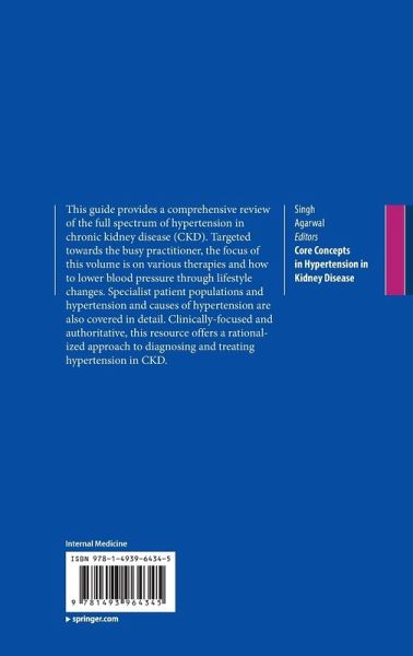 This guide provides a comprehensive review of the full spectrum of hypertension in chronic kidney disease (CKD). Targeted towards the busy practitioner, the focus of this volume is on various therapies and how to lower blood pressure through lifestyle changes. Specialist patient populations and hypertension and causes of hypertension are also covered in detail. Clinically-focused and authoritative, this resource offers a rationalized approach to diagnosing and treating hypertension in CKD.