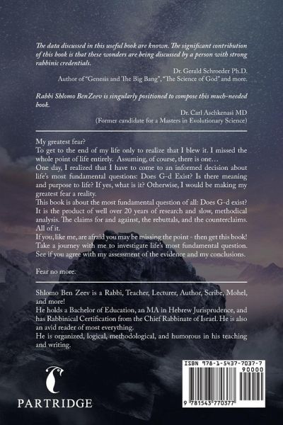 My greatest fear? To get to the end of my life only to realize that I blew it. I missed the whole point of life entirely. Assuming, of course, there is one... One day, I realized that I have to come to an informed decision about life's most fundamental questions: Does G-d Exist? Is there meaning and purpose to life? If yes, what is it? Otherwise, I would be making my greatest fear a reality. This book is about the most fundamental question of all: Does G-d exist? It is the product of well over 20 years of research and slow, methodical analysis. The claims for and against, the rebuttals, and the counterclaims. All of it. If you, like me, are afraid you may be missing the point - then get this book! Take a journey with me to investigate life's most fundamental question. See if you agree with my assessment of the evidence and my conclusions. Fear no more.