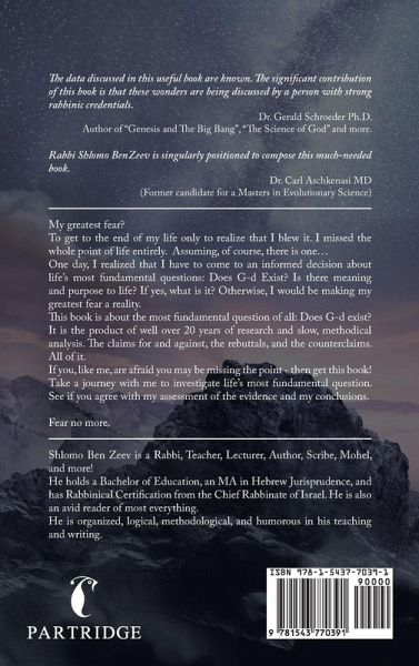 My greatest fear? To get to the end of my life only to realize that I blew it. I missed the whole point of life entirely. Assuming, of course, there is one... One day, I realized that I have to come to an informed decision about life's most fundamental questions: Does G-d Exist? Is there meaning and purpose to life? If yes, what is it? Otherwise, I would be making my greatest fear a reality. This book is about the most fundamental question of all: Does G-d exist? It is the product of well over 20 years of research and slow, methodical analysis. The claims for and against, the rebuttals, and the counterclaims. All of it. If you, like me, are afraid you may be missing the point - then get this book! Take a journey with me to investigate life's most fundamental question. See if you agree with my assessment of the evidence and my conclusions. Fear no more.