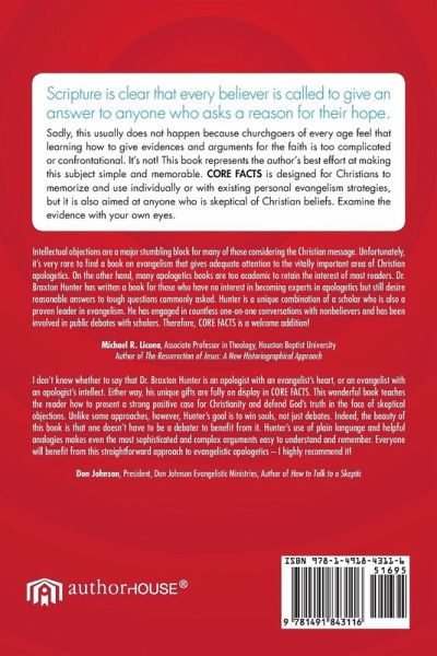 Scripture is clear that every believer is called to give an answer to anyone who asks a reason for their hope. Sadly, this usually does not happen because churchgoers of every age feel that learning how to give evidences and arguments for the faith is too complicated or confrontational. It's not! This book represents the author's best effort at making this subject simple and memorable. CORE FACTS is designed for Christians to memorize and use individually or with existing personal evangelism strategies, but it is also aimed at anyone who is skeptical of Christian beliefs. Examine the evidence with your own eyes.