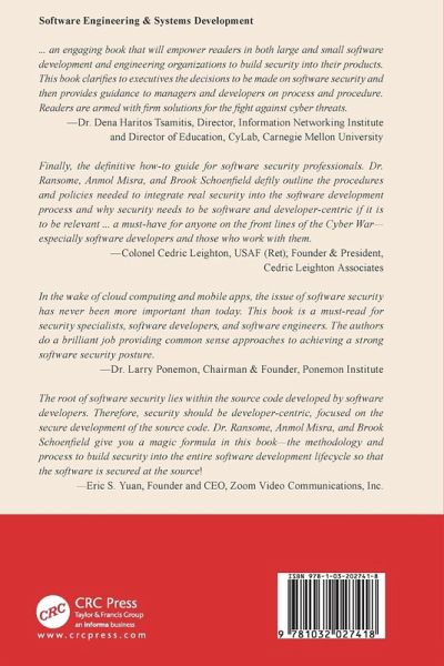 First and foremost, Ransome and Misra have made an engaging book that will empower readers in both large and small software development and engineering organizations to build security into their products. This book clarifies to executives the decisions to be made on software security and then provides guidance to managers and developers on process and procedure. Readers are armed with firm solutions for the fight against cyber threats.