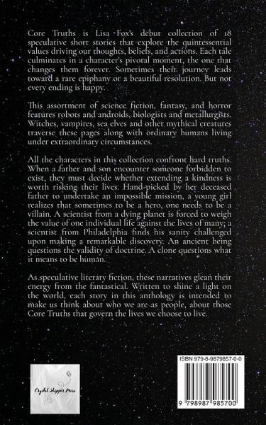 18 speculative short stories...A father and his young son face a choice-risk their lives by extending kindness to a person who is not supposed to exist or risk their souls by walking on. In a dark and starless world where magical creatures are hunted and destroyed, a captive girl's courage sets in motion a wish that will change the skyscape forever. A microbiologist sees things that others do not. But isn't that the nature of science? A scientist from a dying planet weighs the value of one individual life against the lives of many. An ancient being questions the validity of doctrine. A clone questions what it means to be human. CORE TRUTHS: Speculative literary fiction that gleans its energy from the fantastical, making us think about who we are as people, about those Core Truths that govern the lives we choose to live.