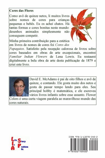 Como avô de quinze netos, li muitos livros sobre nomes de cores para crianças pequenas e bebês. Eu os achei chatos. Há tantas formas e cores bonitas neste mundo: desenhos animados simplesmente não conseguem competir. Minha primeira contribuição para a estética em livros de nomes de cores foi Cores dos Papagaios. Satisfeito pela recepção calorosa de livros sobre cores baseados em obras de arte excepcionais, encontrei Familiar Indian Flowers de Lena Lowis. Eu restaurei digitalmente a bela obra de arte desta publicação de 1879 e criei este livro.