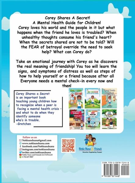 Corey loves himself, his world, and the people in it. What happens when the friend he loves is troubled? When unhealthy thoughts consume his friend's heart? When the secrets shared are NOT to be told? Will the FEAR of betrayal override the need to seek help? What will Corey do? Take an emotional journey with Corey as he discovers the real meaning of friendship! You too will learn signs, and symptoms of mental or emotional distress, and steps of how to help yourself or a friend who needs support. After all... Friends help friends stay safe!