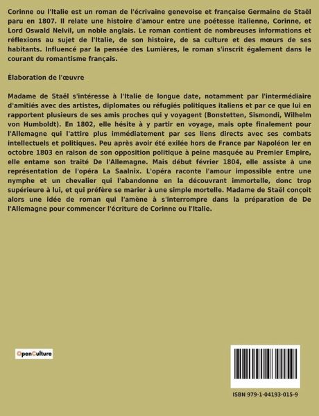 L'Italie, terre de contrastes et de passions, sert de toile de fond à l'histoire de Corinne, une femme d'une intelligence et d'une sensibilité rares. Dans ce troisième volume, Germaine de Staël nous entraîne dans un voyage à travers les paysages envoûtants et les intrigues complexes de la société italienne du début du XIXe siècle. Corinne, artiste et poétesse, incarne la lutte pour l'indépendance et l'expression personnelle dans un monde dominé par les conventions sociales. Sa relation avec Oswald, un noble anglais, est au cur de ce récit, illustrant les tensions entre raison et émotion, devoir et désir. L'uvre explore les thèmes de l'identité et de l'exil, alors que Corinne navigue entre ses aspirations personnelles et les attentes de la société. L'Italie, avec ses ruines antiques et ses paysages pittoresques, devient un personnage à part entière, symbolisant à la fois la beauté et la mélancolie. À travers les yeux de Corinne, le lecteur découvre une réflexion sur la condition féminine et la quête de liberté dans un monde en pleine mutation. Germaine de Staël, figure marquante du romantisme, utilise son héroïne pour interroger les normes culturelles et les préjugés de son époque. En développant une analyse subtile des relations humaines et des dilemmes moraux, ce livre nous apprend à mieux comprendre les complexités de l'âme humaine. Par la fluidité de ses descriptions et la profondeur de ses personnages, nous percevons désormais mieux les enjeux universels de l'amour et de la liberté.