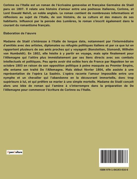 Corinne, une femme d'une intelligence et d'une sensibilité rares, incarne l'esprit libre et créatif de l'Italie du début du XIXe siècle. À travers ses yeux, le lecteur est transporté dans un voyage à travers les paysages envoûtants et les villes historiques de la péninsule italienne. Ce cadre pittoresque sert de toile de fond à une exploration des tensions entre raison et passion, tradition et modernité, qui marquent cette époque de changement. Le récit se déroule dans un contexte où les idéaux romantiques s'opposent aux conventions sociales rigides, offrant une réflexion sur la quête de l'identité personnelle et la place de la femme dans la société. Les thèmes de l'amour, de l'art et de la liberté s'entrelacent dans cette uvre, où Corinne, en tant que poétesse et artiste, défie les normes établies. Sa relation avec Oswald, un noble anglais, met en lumière les différences culturelles et les attentes sociales qui pèsent sur les individus. À travers leurs interactions, le lecteur est invité à réfléchir sur les compromis nécessaires entre les aspirations personnelles et les obligations sociales. Germaine de Staël, par sa plume élégante et perspicace, nous offre une analyse subtile des émotions humaines et des dilemmes moraux. En développant des personnages complexes et en peignant des paysages vibrants, ce livre nous apprend à apprécier la beauté de l'Italie tout en questionnant les valeurs de notre propre société. Par cette uvre, nous percevons désormais mieux les défis de l'émancipation individuelle face aux contraintes collectives.